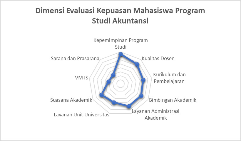 Hasil survei menunjukkan bahwa tingkat kepuasan mahasiswa terhadap layanan Program Studi Akuntansi berada pada kategori sangat baik dengan nilai rata-rata 3,59. Hal ini menunjukkan bahwa sebagian besar layanan akademik, pembelajaran, serta dukungan administrasi yang diberikan oleh program studi dan unit universitas telah memenuhi harapan mahasiswa.