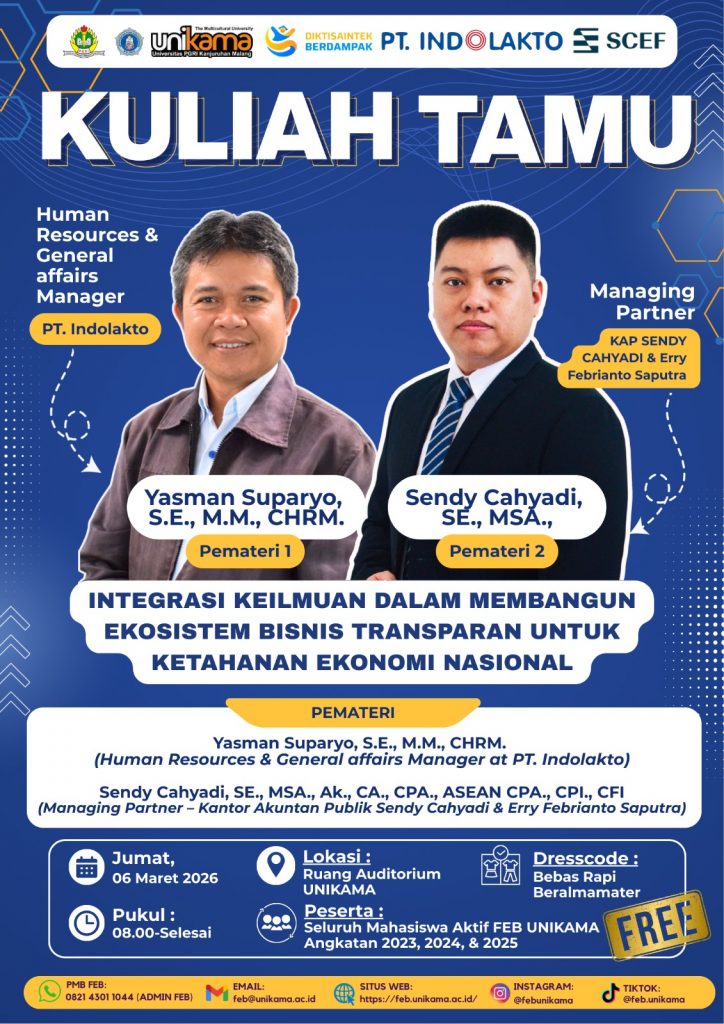 Kegiatan ini GRATIS dan WAJIB bagi mahasiswa aktif FEB Angkatan 2023, 2024, & 2025. Jangan lewatkan kesempatan untuk belajar langsung dari para praktisi hebat! #FEB #febunikama #UNIKAMA